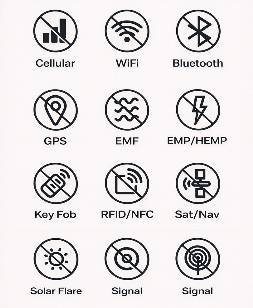 All encased copper mesh pocket that blocks all signals coming in and out as well as energized waves such as EMP / Solar Flares